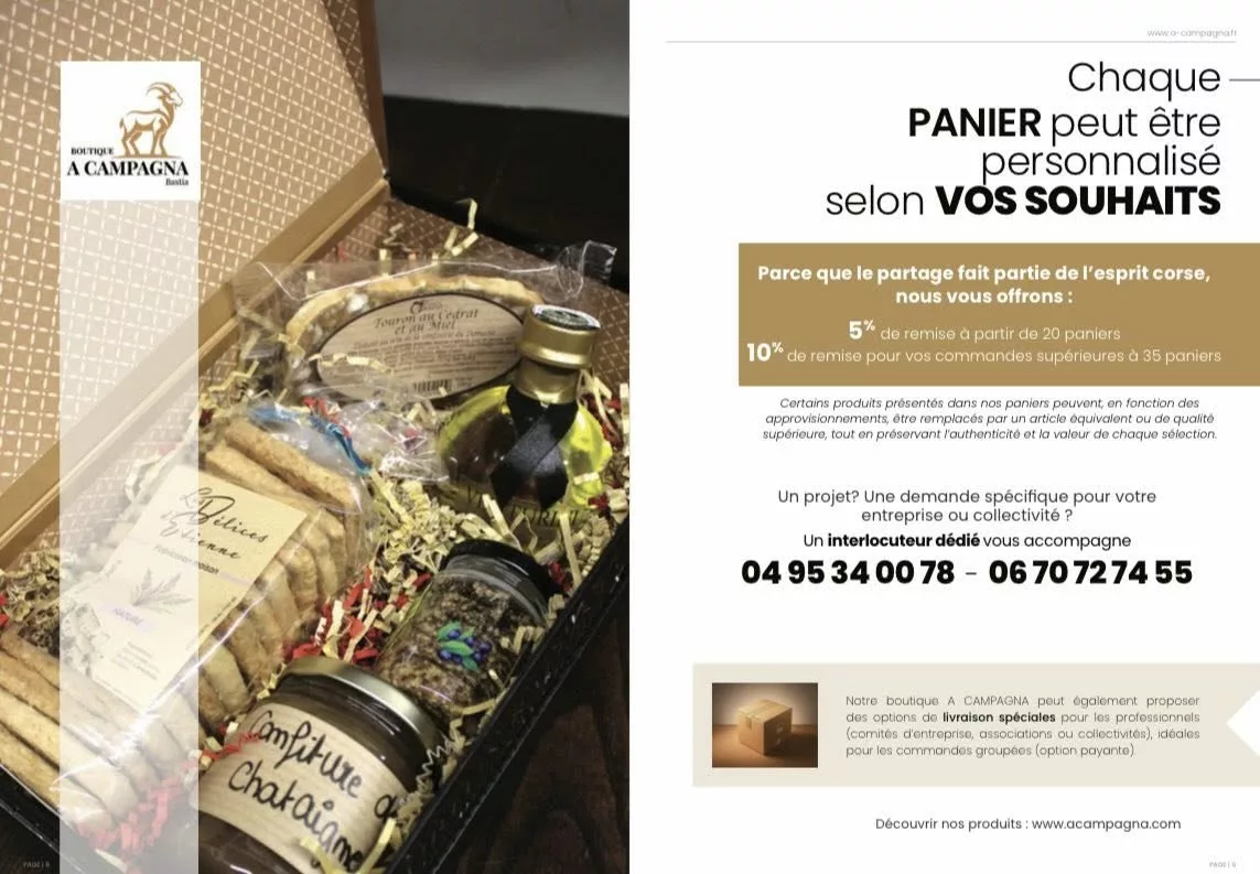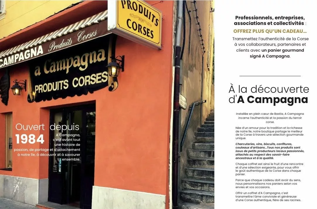 Bienvenue chez A Campagna, votre boutique familiale et épicerie fine située au 25 Rue César Campinchi, à Bastia. Véritable vitrine du patrimoine gastronomique insulaire, nous sélectionnons pour vous l'excellence du terroir corse. Que vous soyez de passage sur le Vieux-Port ou que vous souhaitiez commander depuis le continent, notre équipe vous propose une immersion dans les saveurs authentiques de l'île : charcuteries artisanales (Figatellu, Coppa, Lonzu), fromages fermiers, miels de maquis (Maison Buti), confitures (Domaine Orsini) et biscuits traditionnels (L'Olmu). Nous mettons un point d'honneur à valoriser le savoir-faire de nos producteurs locaux. Profitez de nos conseils en boutique ou de notre service de livraison rapide partout en France pour savourer le meilleur de la Corse où que vous soyez.