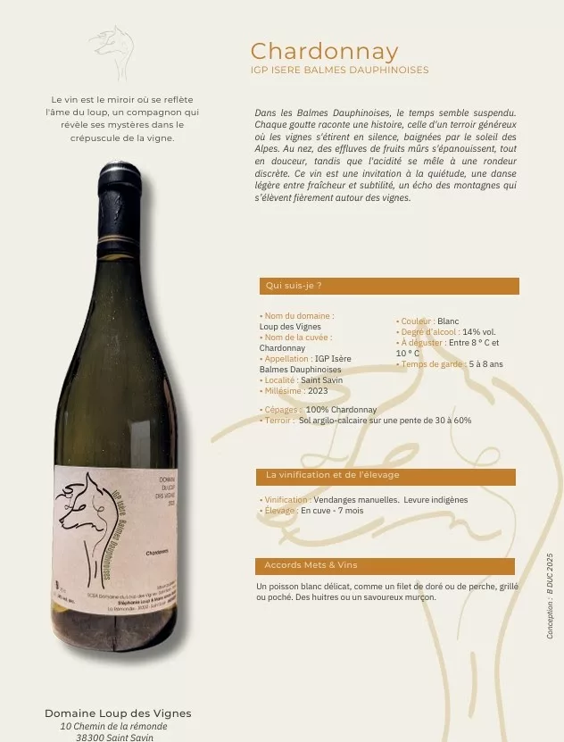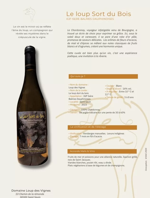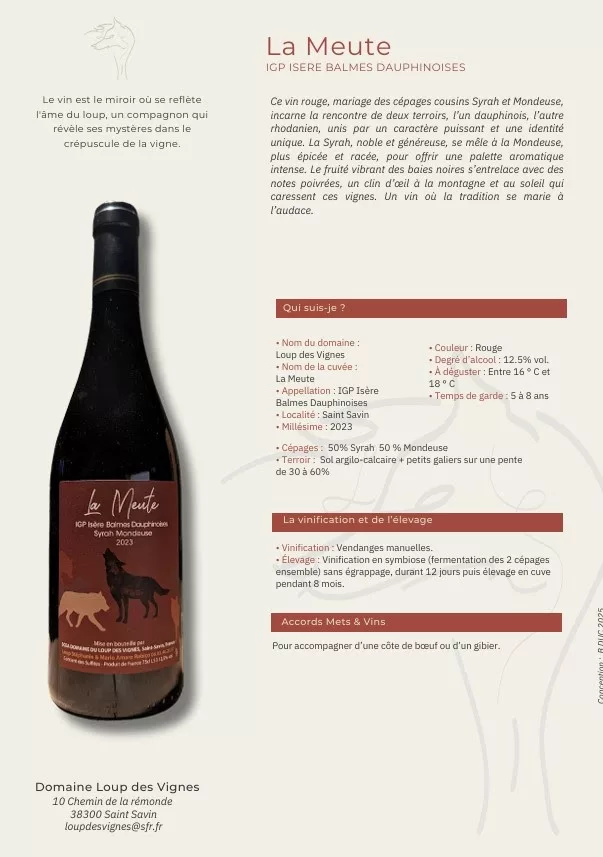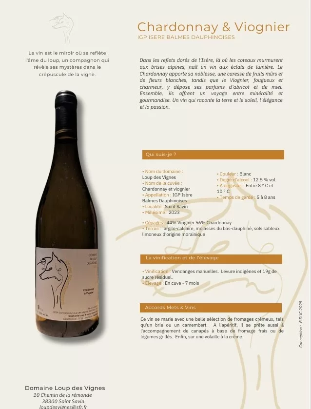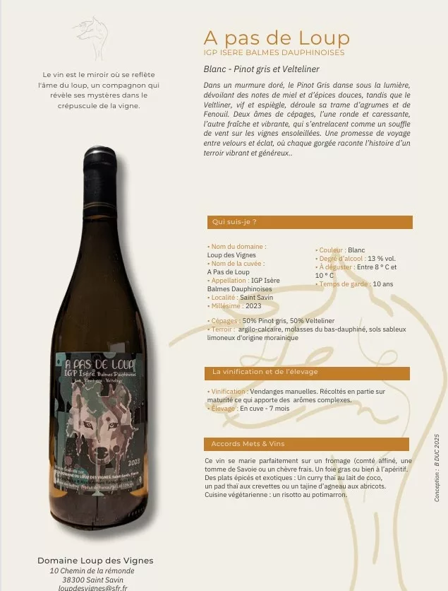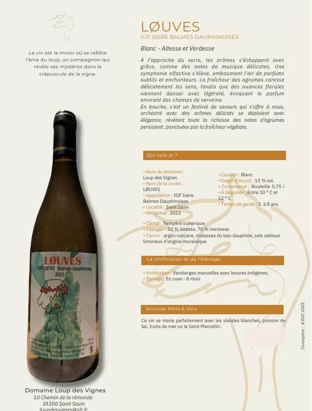 La spécialité du lieu : Le Domaine du Loup des Vignes (Stéphanie & Mario Loup, 9 ha) est situé à Saint-Savin (Isère), sur des coteaux jusqu'à 70 % de pente. Le domaine est spécialisé dans les IGP Isère / Balmes Dauphinoises, cultivant une grande variété de cépages (Syrah, Viognier, Chardonnay, Mondeuse, etc.). Leur production comprend des vins tranquilles (Rouge, Blanc, Rosé) et des vins mousseux.