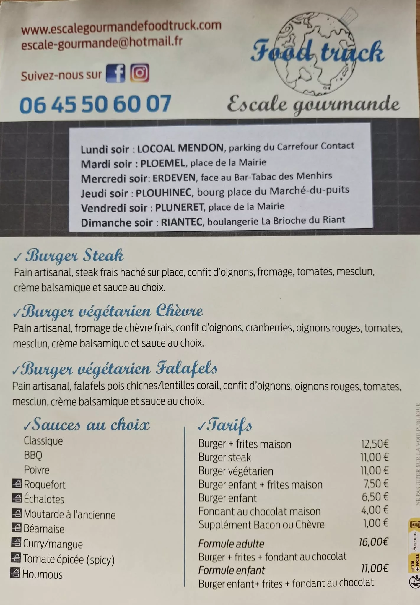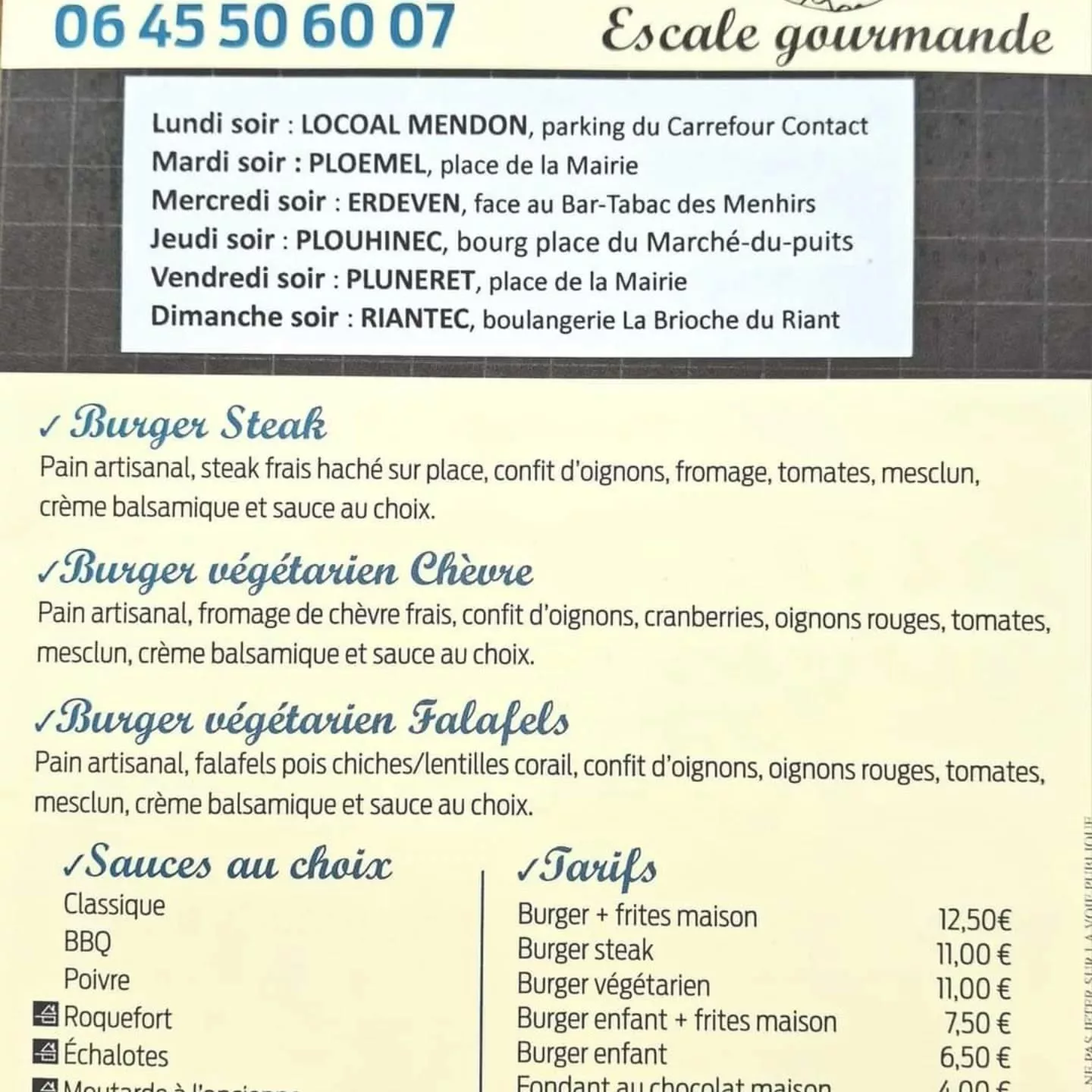 L'Escale Gourmande est un Food Truck et Traiteur (Philippe et Cathy Delépine) qui sillonne les routes du Morbihan (56) depuis 2011. Le concept est basé sur le "fait maison" et les produits frais et locaux. La qualité est primordiale, avec l'utilisation de viande de race bovine bretonne hachée sur place et de pain artisanal. Engagé écologiquement, le Food Truck utilise des emballages compostables et encourage les contenants réutilisables. Il propose un service traiteur pour événements privés (privatisation dès 40 personnes) et offre des menus inclusifs (végétarien, sans gluten, sans lactose, végétalien).