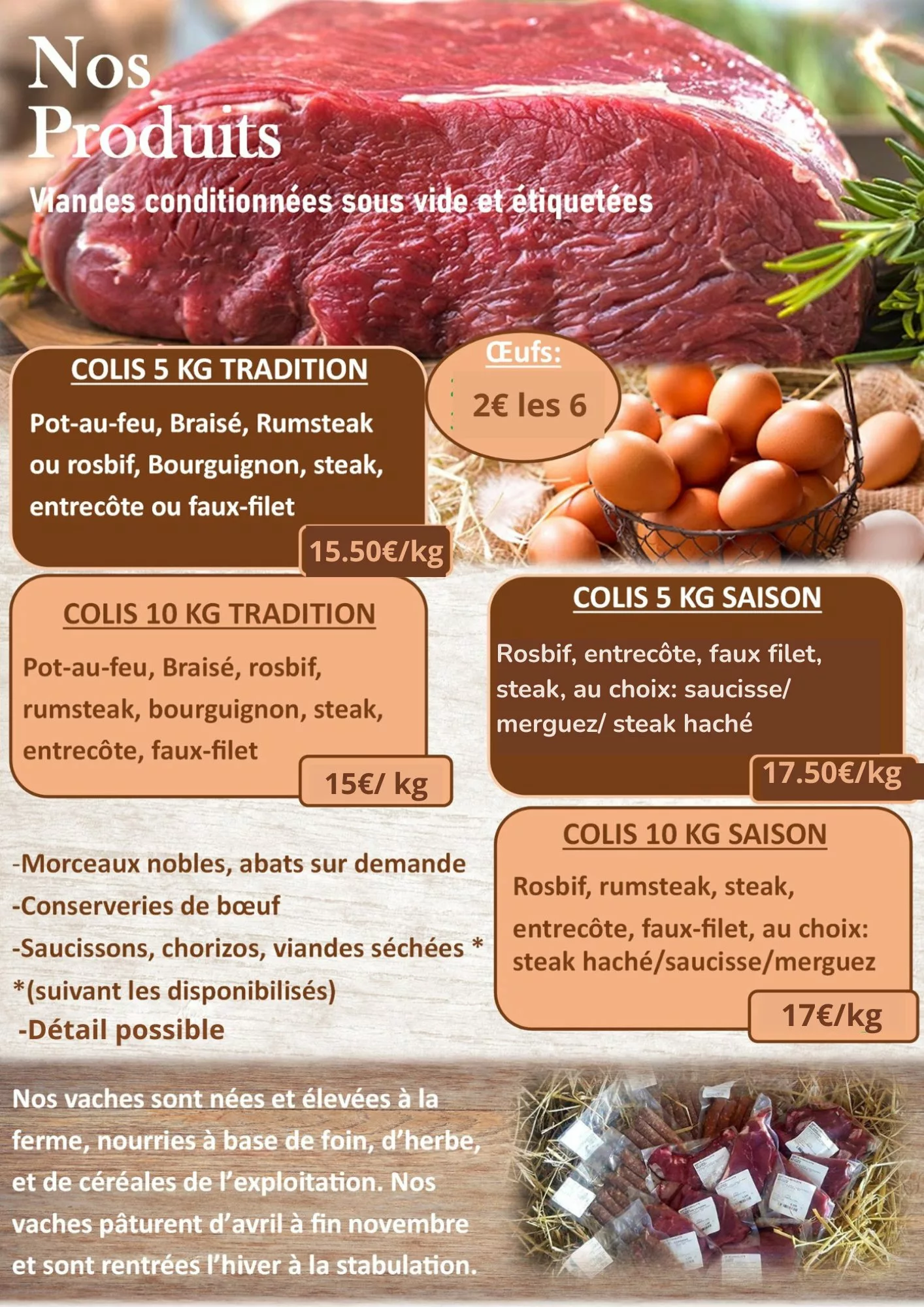 Bienvenue à la Ferme de Saint-Denis, située à Bourbon-Lancy, au cœur du berceau de la race Charolaise. Forts de notre savoir-faire d'éleveurs passionnés, nous avons choisi de supprimer les intermédiaires pour vous proposer une viande de bœuf charolais d'exception en direct de l'exploitation. Nos bêtes sont élevées avec soin, garantissant une viande tendre, persillée et riche en saveurs. Outre la vente à la ferme, nous nous spécialisons dans la livraison à domicile pour vous apporter le meilleur du terroir directement dans votre cuisine. Chaque morceau est préparé, découpé et emballé avec une traçabilité totale. En choisissant la Ferme de Saint-Denis, vous soutenez un circuit court authentique et profitez d'une qualité bouchère incomparable.