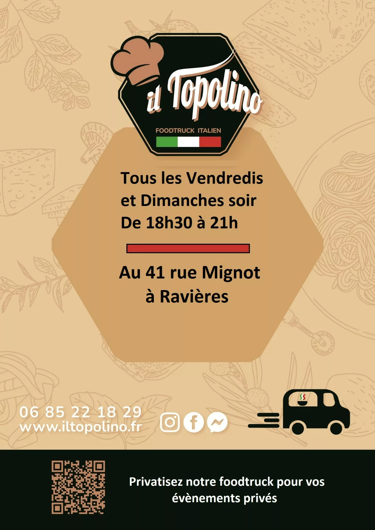 Il Topolino est un food truck qui partage une cuisine italienne authentique, saine et gourmande, inspirée par les origines siciliennes de l'un des fondateurs. C'est l'histoire d'un couple passionné qui a à cœur de faire découvrir des recettes familiales. L'entreprise utilise des produits locaux et/ou italiens pour garantir la qualité de ses plats. Basé dans le Tonnerrois (Yonne, 89), le food truck est présent à des rendez-vous hebdomadaires fixes (consulter leur calendrier en ligne) et peut être privatisé pour tout événement spécial, qu'il soit professionnel (séminaires, salons) ou privé (célébrations familiales).