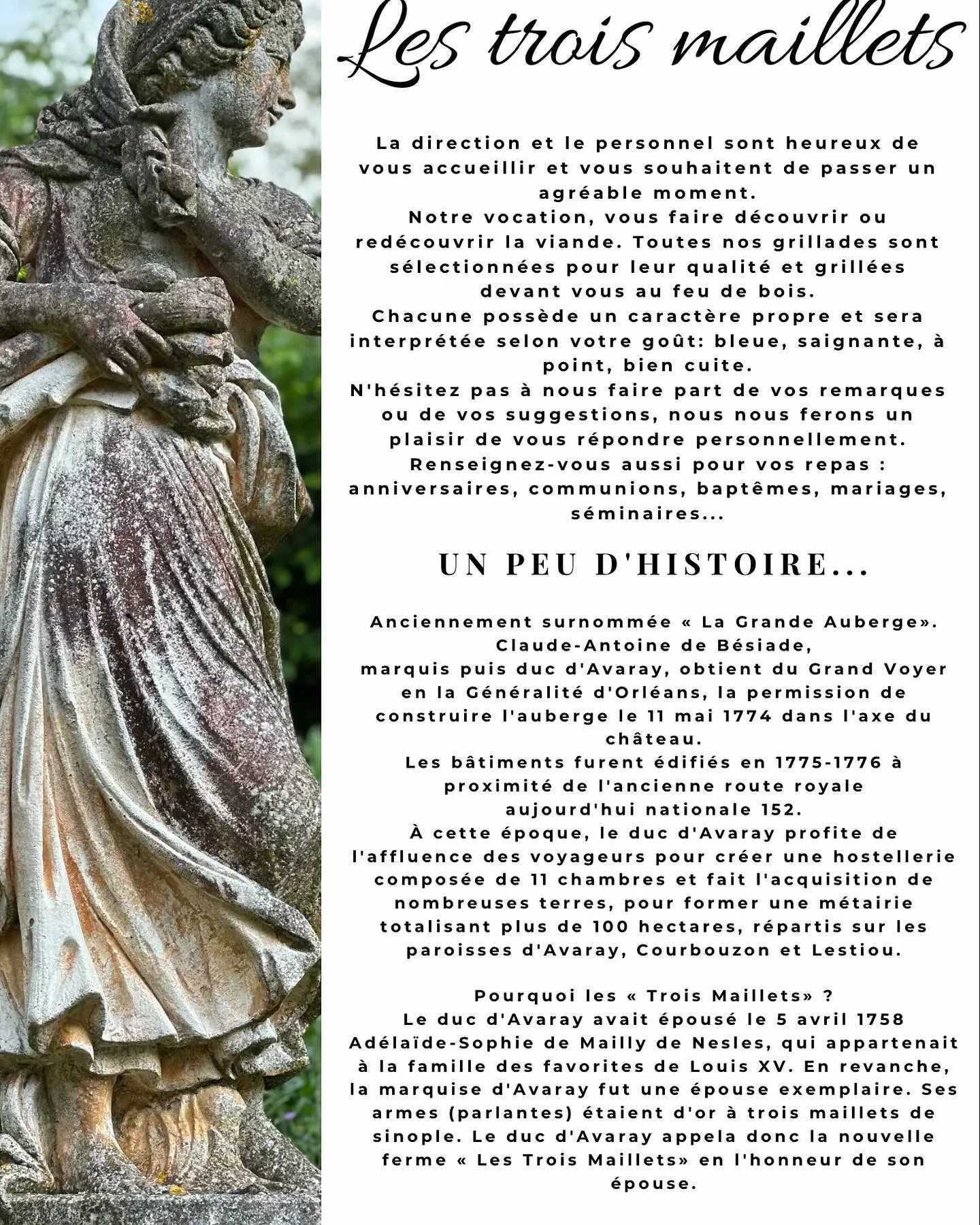 La Ferme des Trois Maillets est une charmante auberge de campagne et hôtel, située sur la RN 152 à Avaray (41500), à mi-chemin entre Blois et Orléans, près du château de Chambord. Installée dans un bâtiment en pierre datant du XVIIIe siècle, l'établissement a su préserver son authenticité. Le concept est celui d'une cuisine française de tradition, généreuse et faite maison, servie dans un cadre rustique avec une cheminée moderne et une atmosphère douillette. L'auberge dispose d'une belle terrasse et d'un jardin bien entretenu avec un étang. L'accueil est fréquemment loué par les clients, qui apprécient la gentillesse du personnel et de la gérante Graziella Brouard.