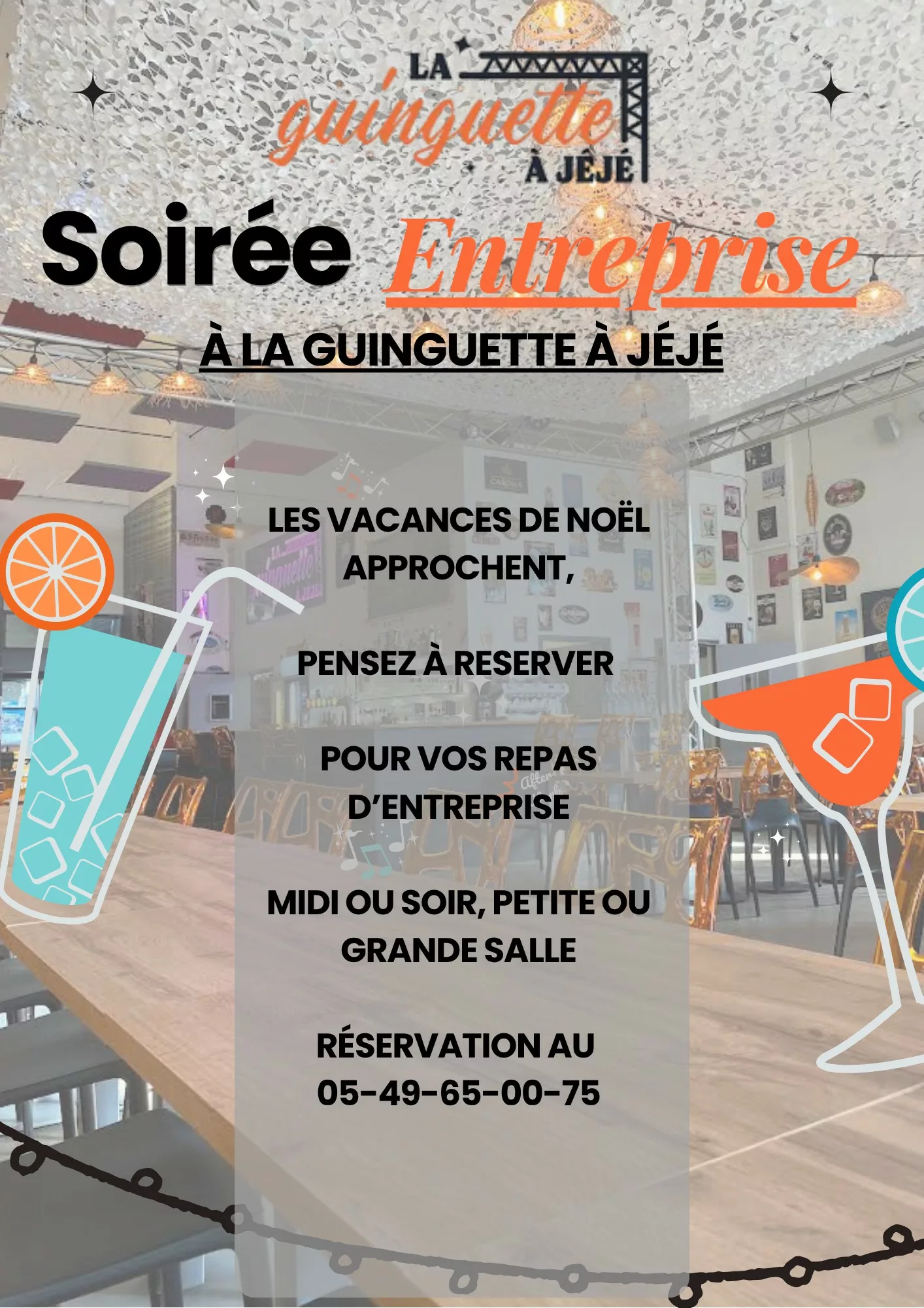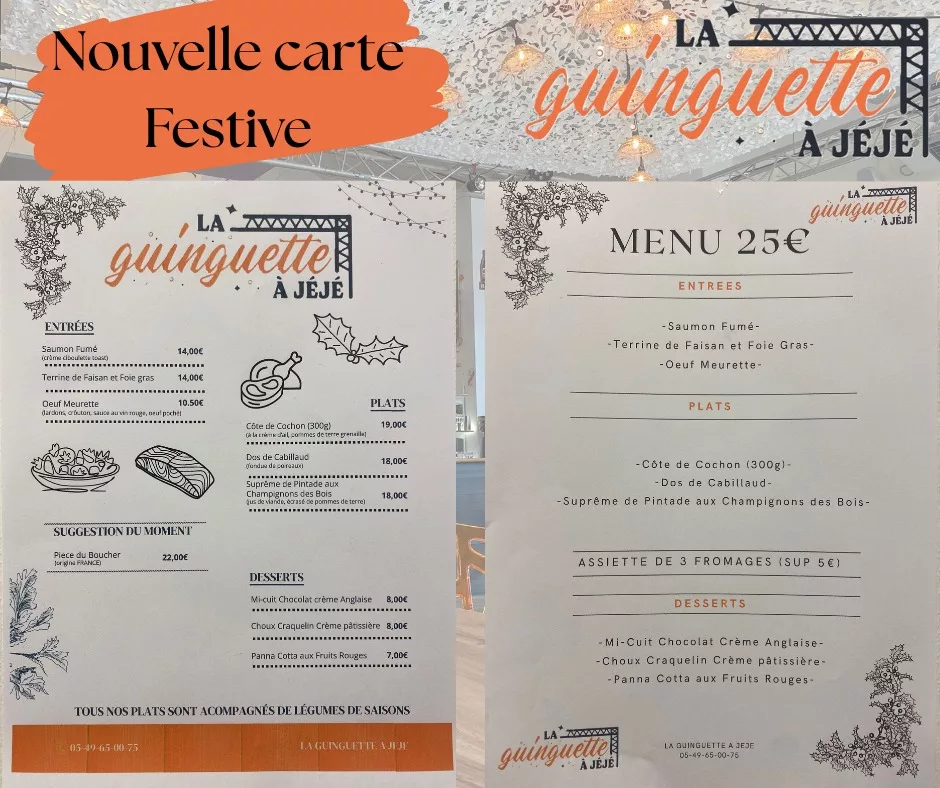 Bienvenue à La Guinguette à Jéjé, l'adresse incontournable de Bressuire pour ceux qui cherchent à conjuguer simplicité, partage et convivialité. Idéalement située sur le Boulevard du Maréchal Foch, notre guinguette vous accueille dans une atmosphère chaleureuse et décontractée, typique des bords d'eau d'antan remis au goût du jour. Que ce soit pour un déjeuner entre collègues, un verre entre amis après le travail ou un dîner festif en famille, Jéjé et son équipe vous reçoivent avec le sourire. Ici, on cultive l'art de vivre : une décoration authentique, une terrasse accueillante et une ambiance vibrante qui fait battre le cœur de la ville. Un lieu de vie où l'on prend le temps de savourer l'instant présent.