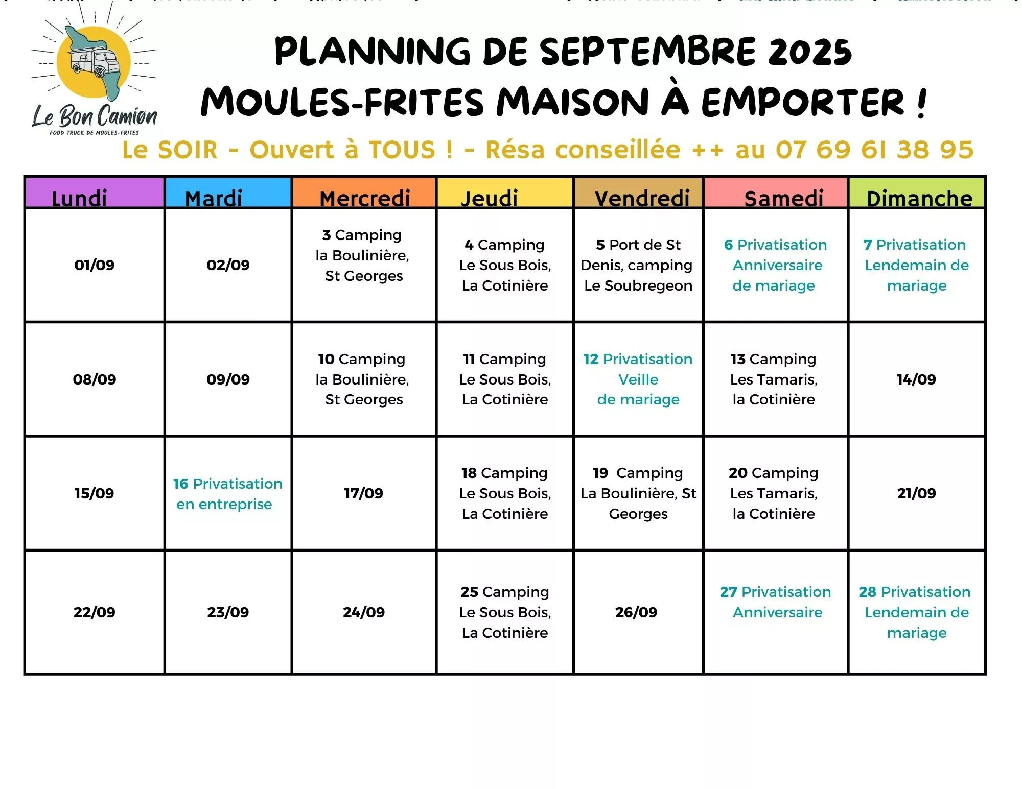 Depuis 2017, Le Bon Camion régale les amateurs de fruits de mer avec son concept original : un food truck proposant des moules-frites maison sur l'île d'Oléron. Installé à Saint-Denis-d'Oléron, ce camion convivial offre des moules fraîches accompagnées de frites maison, dans une ambiance chaleureuse et décontractée. Les sauces disponibles incluent la marinière, le roquefort et la sauce Oléron, permettant à chacun de savourer ce plat traditionnel selon ses préférences. Les clients apprécient particulièrement la qualité des produits, le fait maison et l'accueil souriant de l'équipe. Le Bon Camion participe également à des événements locaux tels que le marché gourmand de Dolus, offrant ainsi une expérience culinaire unique dans un cadre pittoresque.