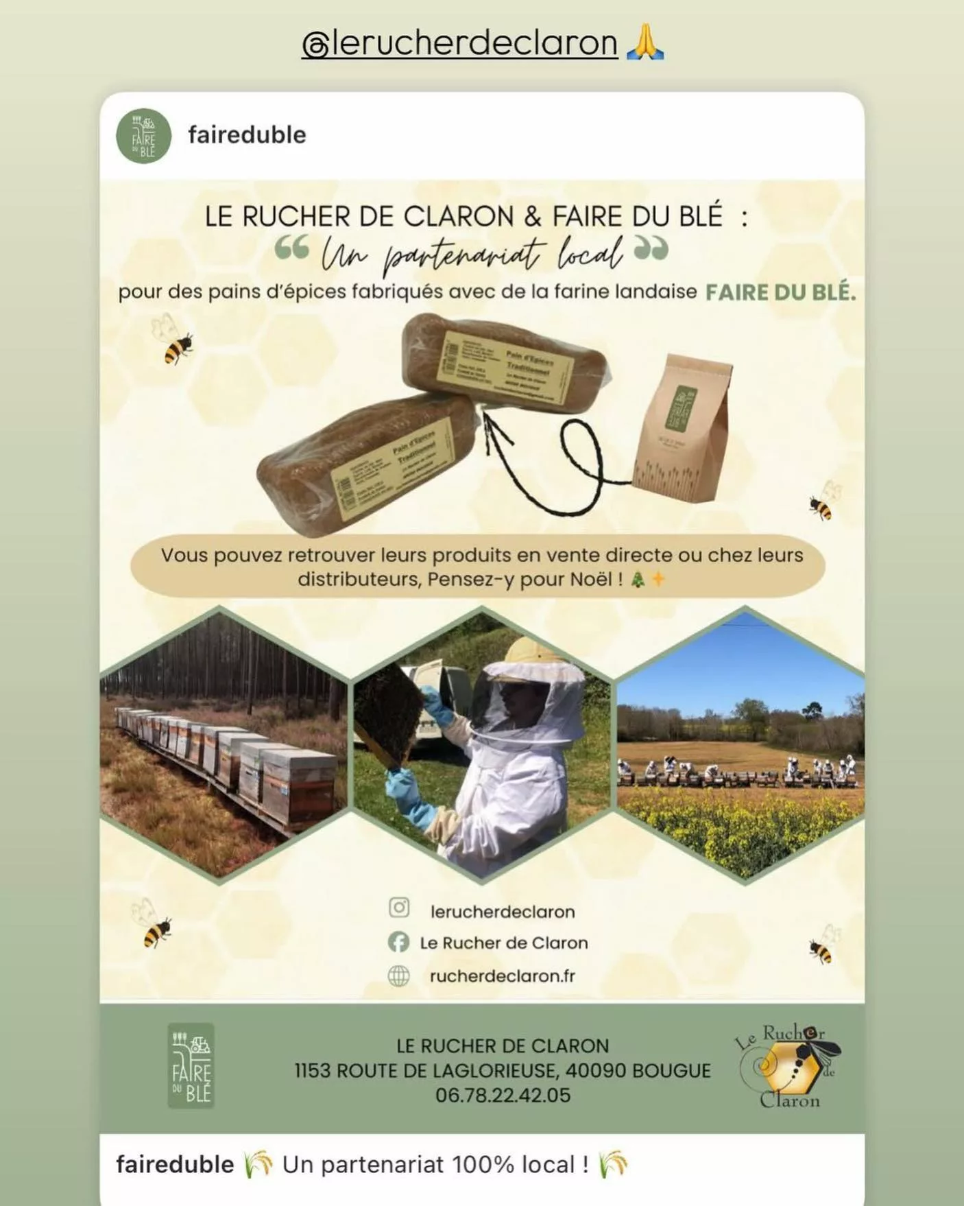 Le Rucher de Claron est une entreprise d'apiculture créée en 1999 par Véronique Delpuech et désormais co-gérée par Julien Laffargue, Guillaume Boueilh et Mathieu Laffargue. Situé à Bougue (40090), au cœur de la forêt Landaise, le Rucher de Claron est spécialisé dans la production de miel 100% Landais d'exception. Leur engagement pour la qualité leur a valu plusieurs distinctions au Concours National des miels de France (Médailles d'or pour le Miel d'acacia et le Miel de fleurs des Landes, Médaille d'argent pour le Miel de bruyères). L'entreprise a étoffé son offre avec des produits gourmands, bien-être et des services apicoles.