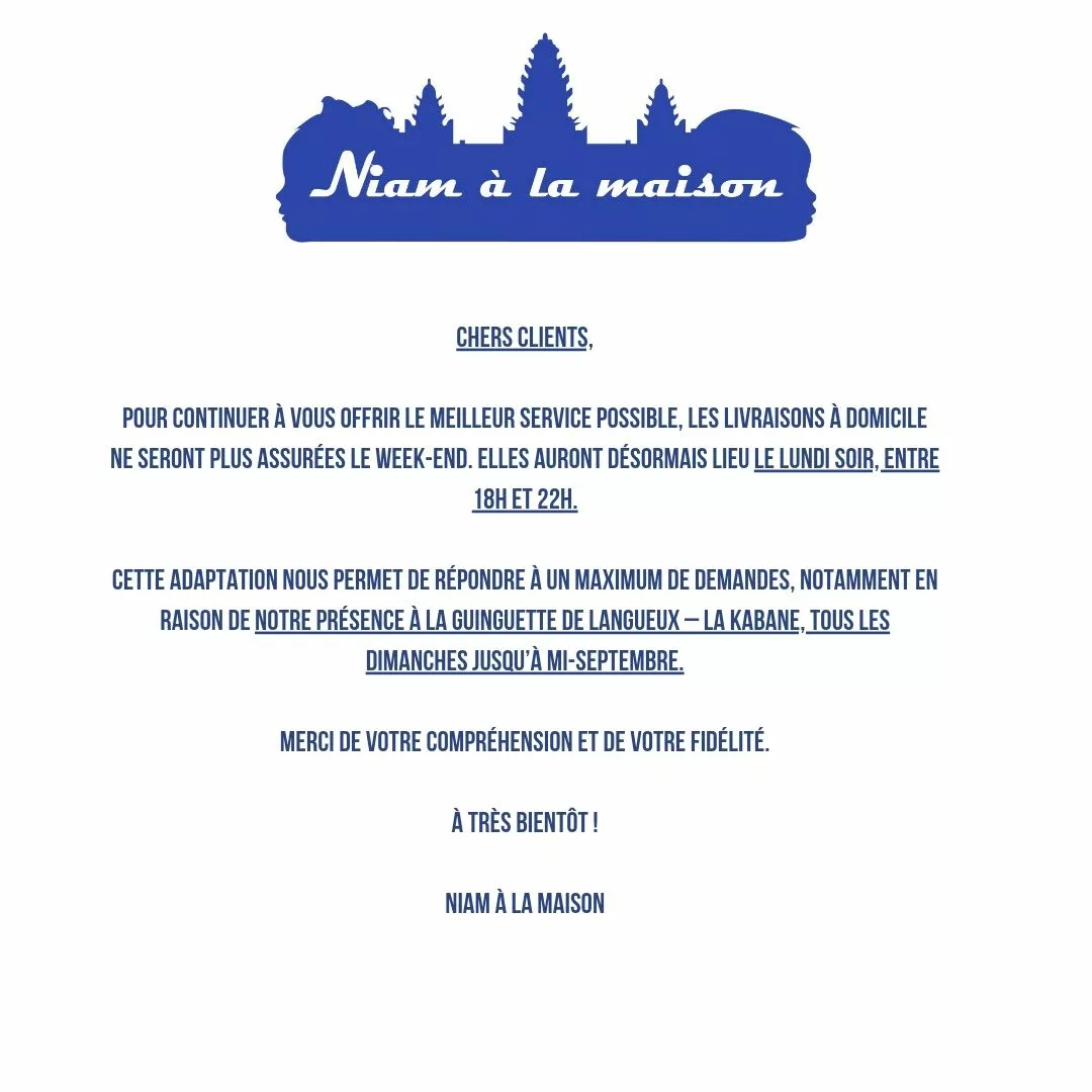 Nia'm à la maison est un Food Truck asiatique opérant dans les Côtes-d'Armor (22), notamment autour de Pordic, Plérin, Langueux et Binic. Le concept est de proposer une cuisine faite maison inspirée des recettes traditionnelles Cambodgiennes et Laotiennes, tout en les revisitant grâce à l'utilisation de produits locaux et bretons (bœuf, légumes). Cela garantit un voyage culinaire unique qui allie les saveurs d'Asie à l'ancrage local.
