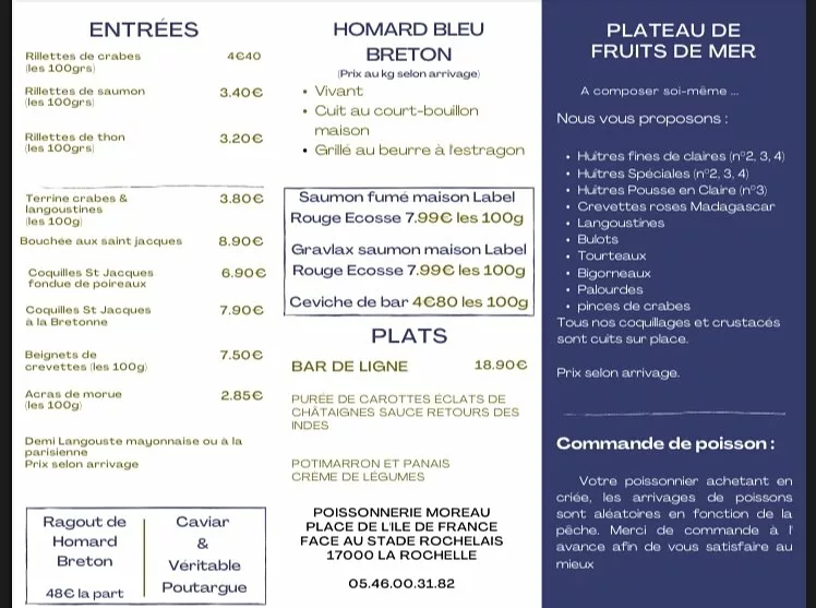 Située sur la Place de l'Île de France à La Rochelle, la Poissonnerie Moreau est une adresse de référence pour tous les passionnés de produits halieutiques. Cet établissement polyvalent combine avec succès les activités de poissonnerie traditionnelle, de traiteur de la mer et de restaurant. Ancrée dans le paysage rochelais, la maison se donne pour mission de proposer le meilleur de l'océan, en mettant l'accent sur la fraîcheur absolue et la diversité des arrivages. Que ce soit pour acheter un poisson entier à préparer soi-même, commander un plat traiteur pour un événement ou s'attabler pour déguster une cuisine marine authentique, la Poissonnerie Moreau offre un service complet. L'expertise de l'équipe et la qualité des produits sélectionnés en font une escale gourmande incontournable pour les habitants et les visiteurs de la cité maritime, privilégiant le goût et le savoir-faire artisanal.