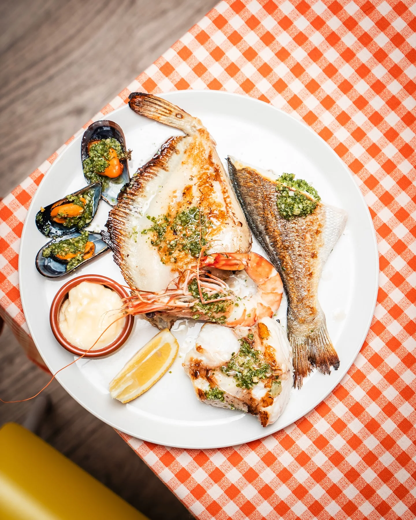 Le menu varie selon les arrivages : fruits de mer, poissons, volailles et plats régionaux, avec des plats à partager et des suggestions selon la pêche du jour.